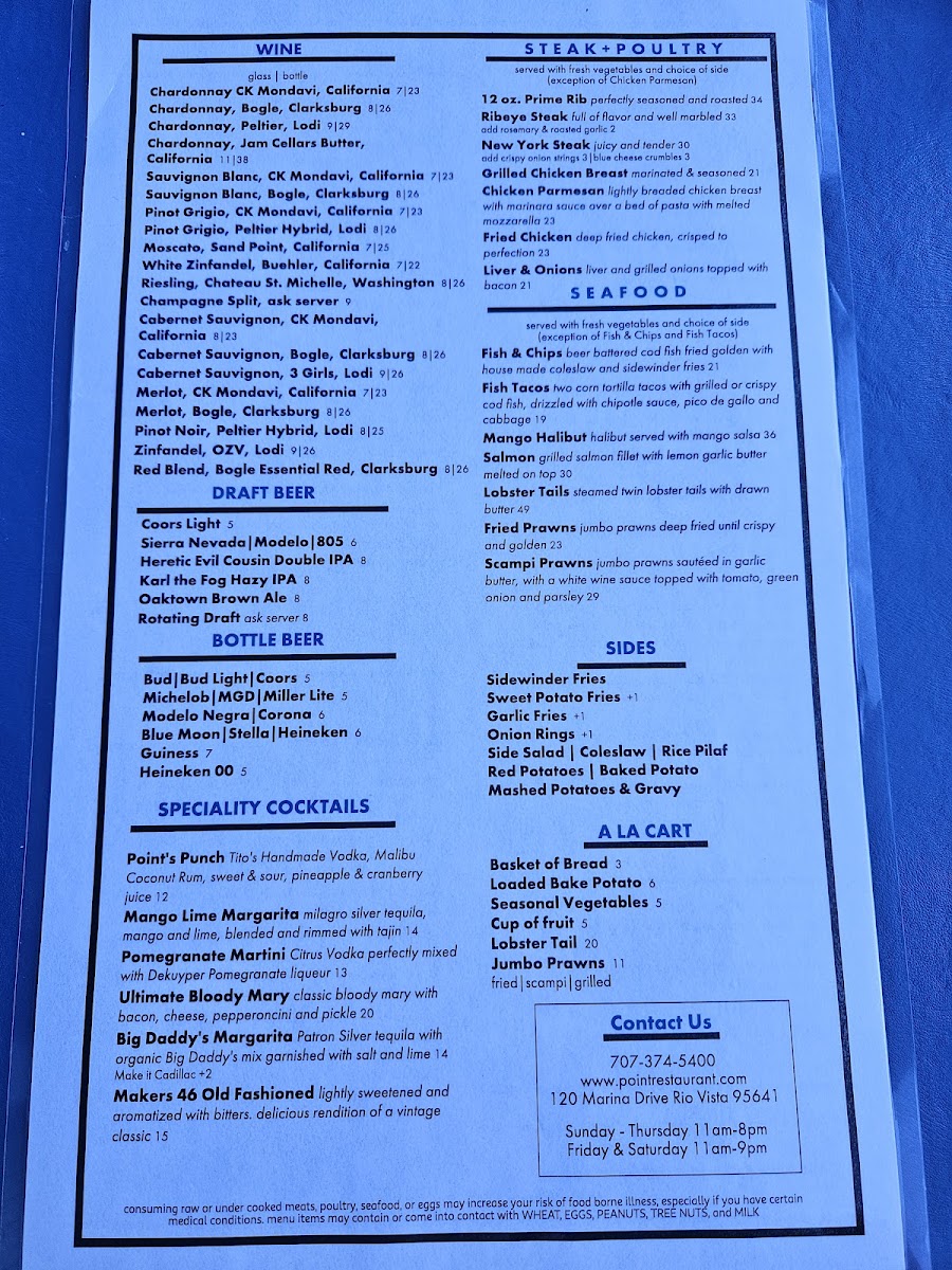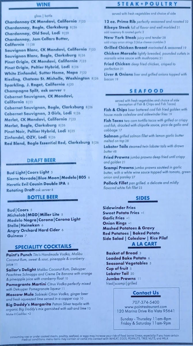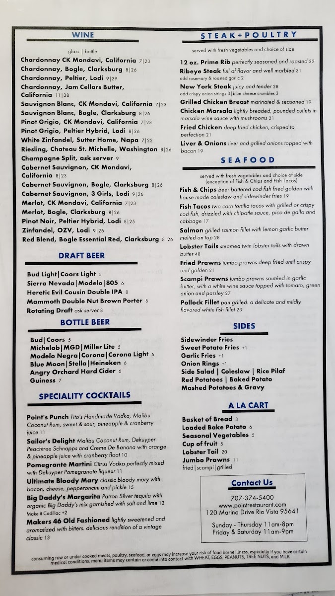 Welcome to The Point Restaurant, a charming American eatery nestled on the tranquil banks of the Sacramento River at 120 Marina Dr, Rio Vista, CA. As you enter this beloved local establishment, you're instantly greeted by a warm, nostalgic atmosphere that radiates old-school charm—a delightful echo of the classic diners from yesteryears.